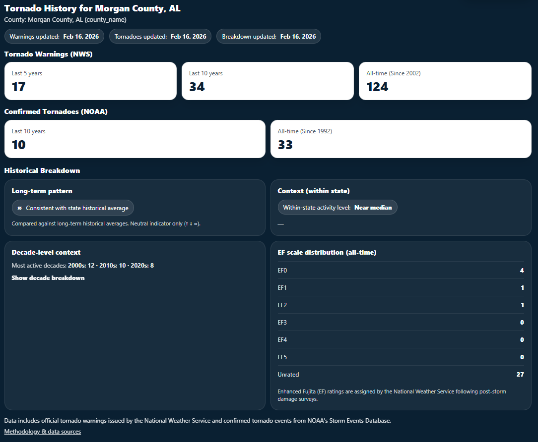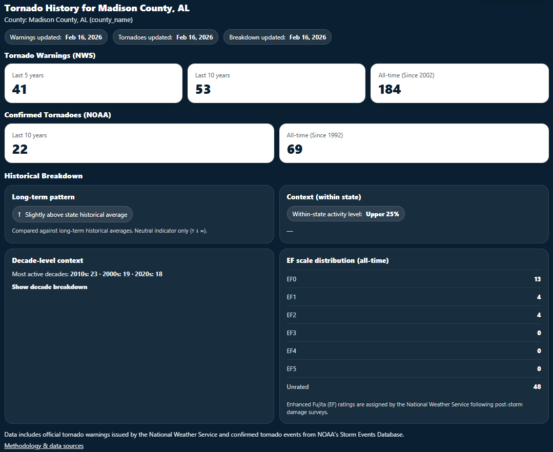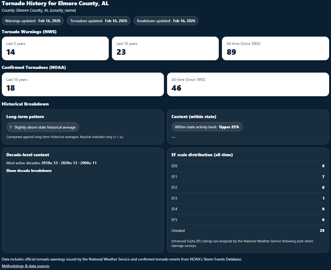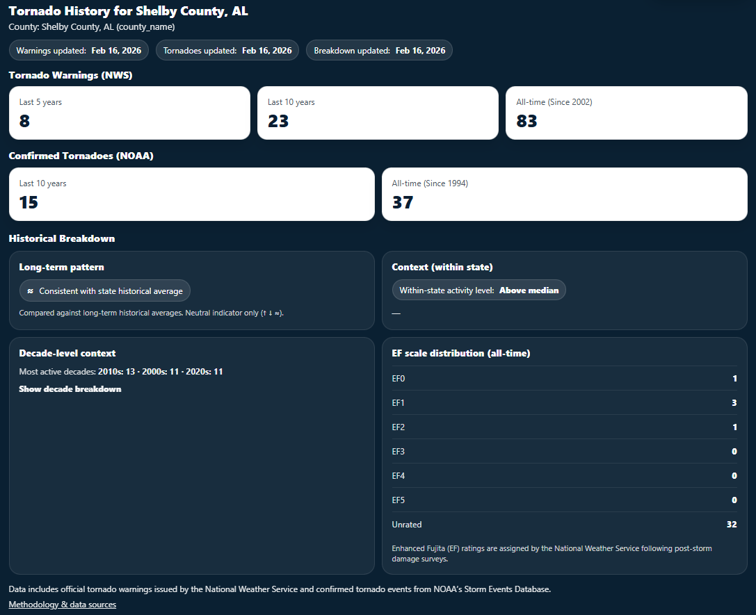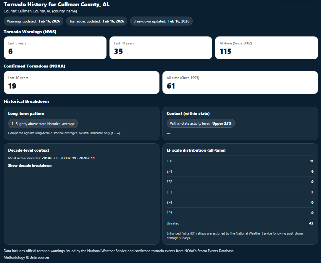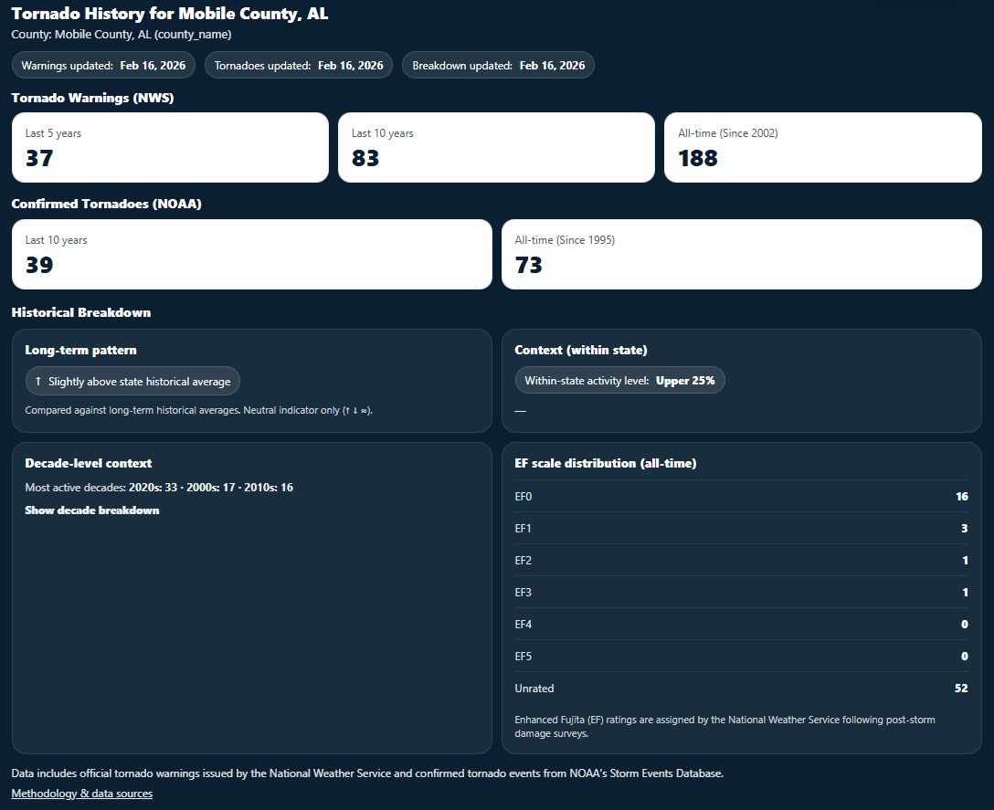 For detailed ZIP code searches or full county breakdowns, visit the Alabama Tornado History page.