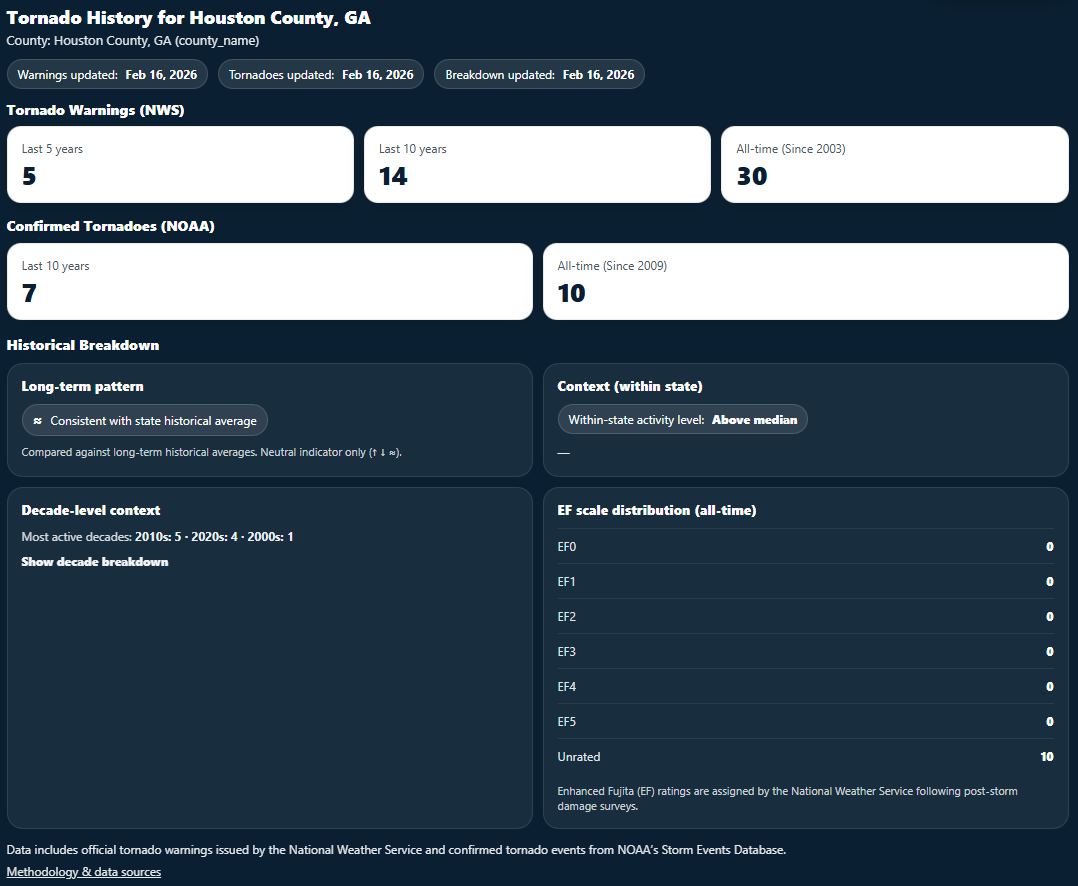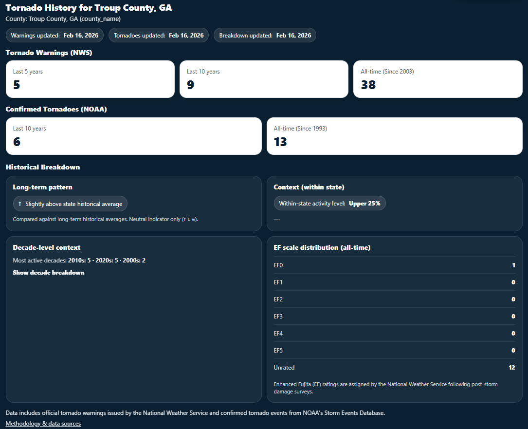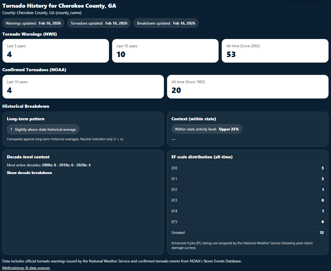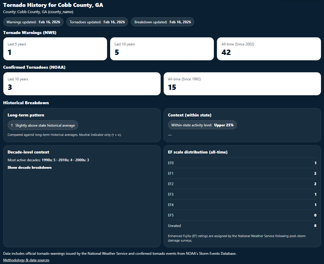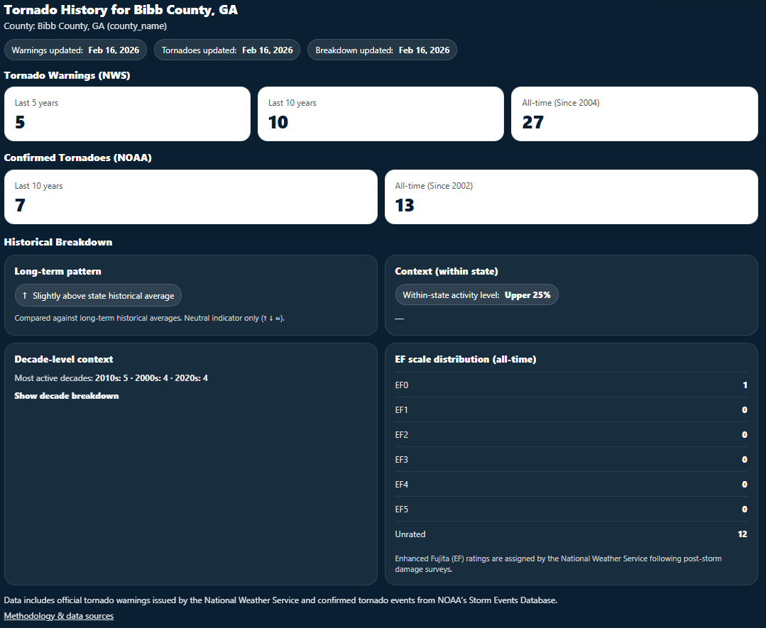 For detailed ZIP code searches or full county breakdowns, visit the Georgia Tornado History page.